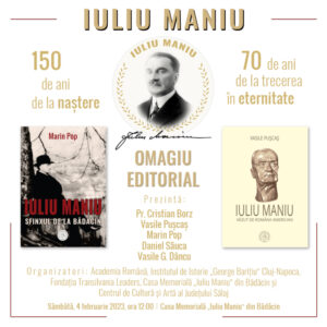 Vă așteptăm sâmbătă, 4 februarie 2023, ora 12:00, la Casa Memorială „Iuliu Maniu” din Bădăcin, să participați la lansarea cărților „Iuliu Maniu. Sfinxul de la Bădăcin” de Marin Pop și „Iuliu Maniu văzut de românii americani” de Vasile Pușcaș, publicate de Editura Școala Ardeleană în Colecția Istorie contemporană.