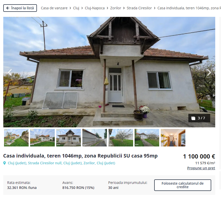 Nu mai este un secret pentru nimeni că piața imobiliară din municipiul Cluj-Napoca a explodat, însă, uneori, pe internet apar anunțuri care întrec orice imaginație. O casă din cartierul Zorilor a fost scoasă la vânzare pe internet. Internauții clujeni au fost oripilați de prețul halucinogen care este cerut pentru acest imobil. Mai exact, vânzătorul solicită suma exorbitantă de 1.100.000 de Euro. Casă beneficiaza, într-adevăr, de un teren de peste 1000 de metri pătrați, acesta fiind probabil singurul argument care ar putea justifica prețul inedit.